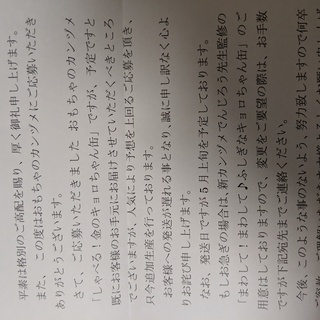 なんだと開けてみると、こんな文章が。応募した金のキョロちゃんが、人気しすぎて生産が追いつかないとか。