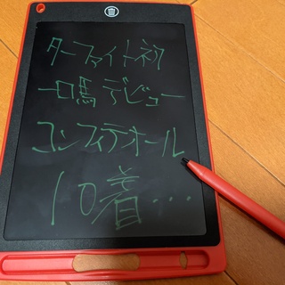 先ほどの電子メモパッドをはオンラインクレーンゲームで取って今日届いたものですが、何度も消せて使えるのはいい。iPadより軽いし。
